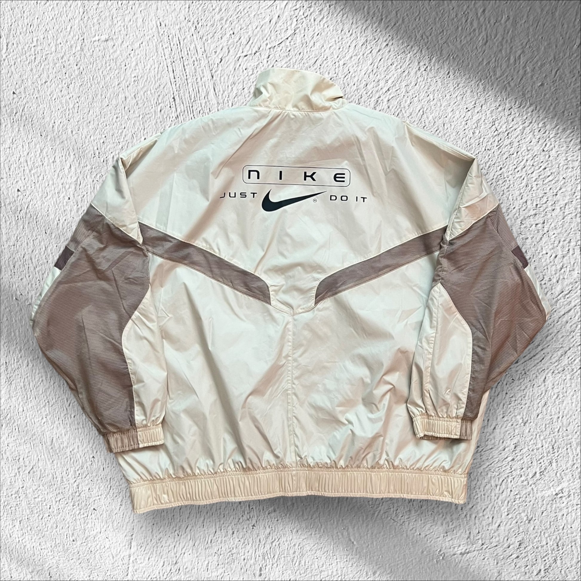 brown tan Nike windbreaker, vintage style Nike outerwear, women’s oversized jacket, streetwear windbreaker, retro athletic jacket