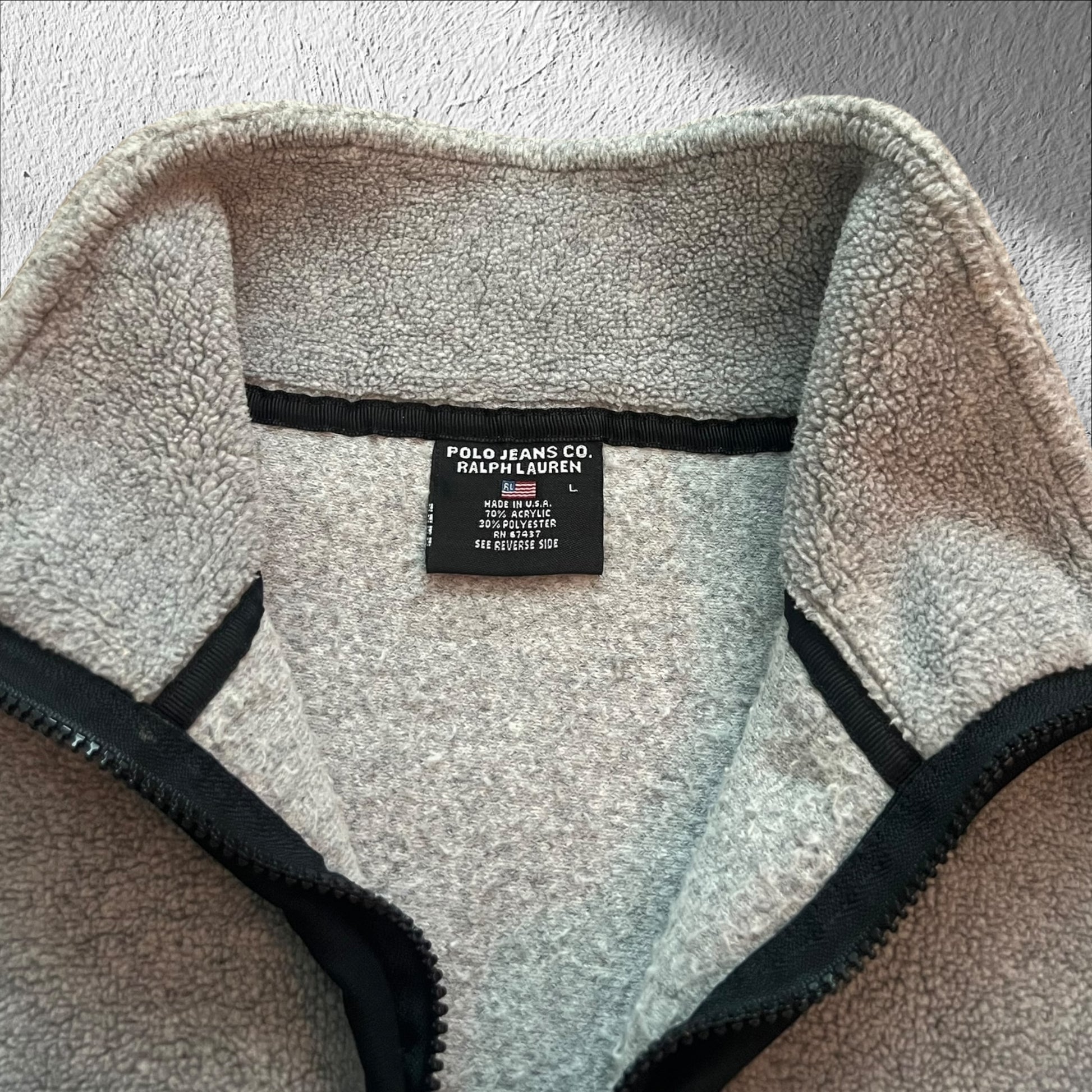 Authentic 1990s Polo Ralph Lauren Jeans Co fleece pullover in gray with black stripes. A clean, classic vintage piece with a relaxed fit and soft fleece feel—perfect for everyday wear or layering.