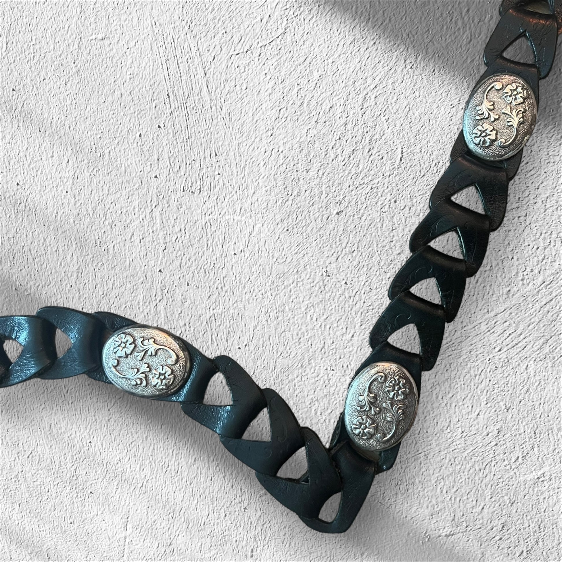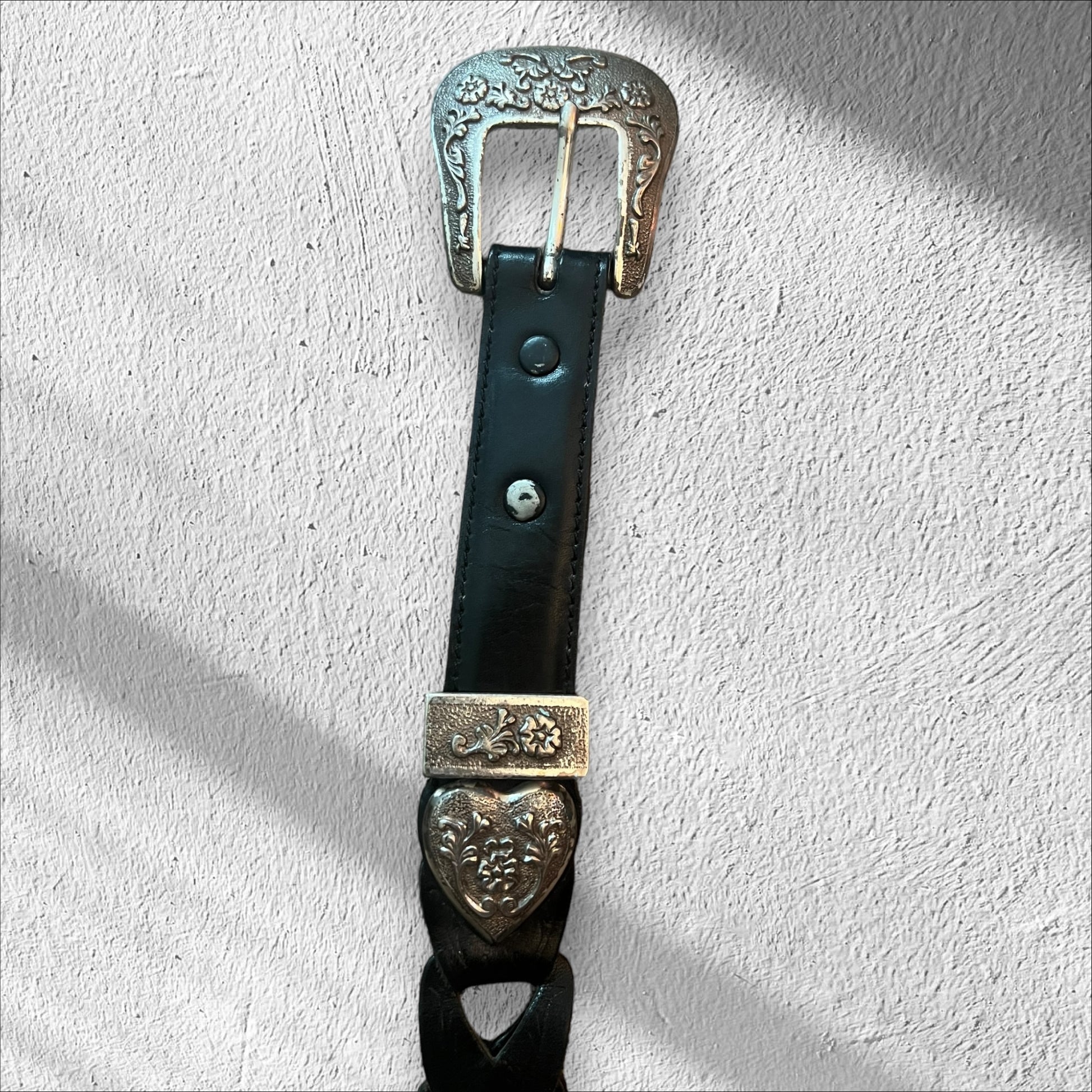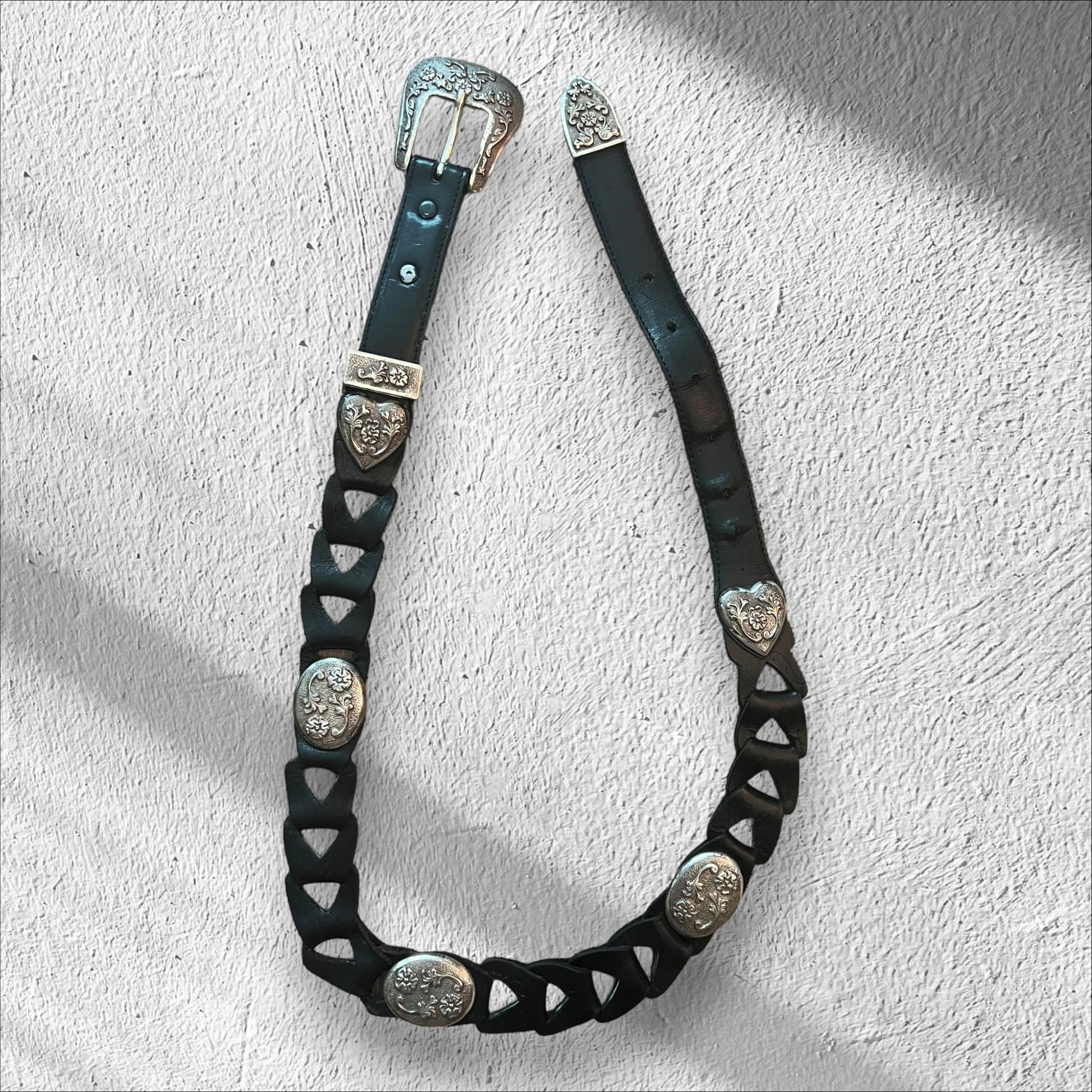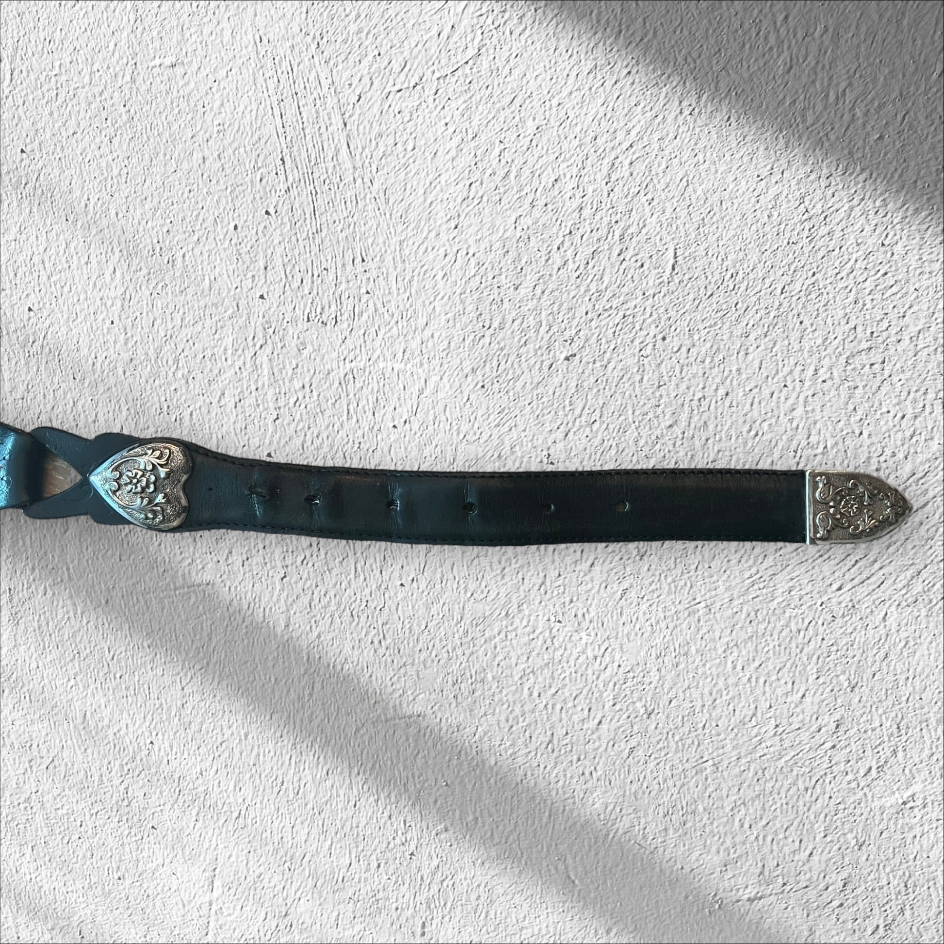 This vintage Resistol belt is a beautifully crafted statement piece featuring detailed metal engraving and heart-shaped bezels that highlight its Western-inspired charm. The black leather strap contrasts perfectly with the silver-tone floral etching, giving it both elegance and edge. Ideal for vintage collectors or anyone looking to elevate their outfit with a timeless Western accessory.
